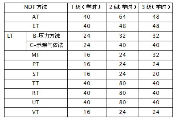 ISO9712-2012标准中相关方法的规定培训时间如下表所示,不得低于其要求,但可以大于规定学时。