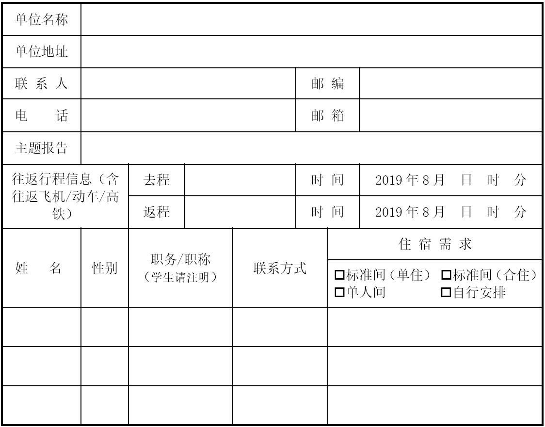 注:会议入住宾馆为新华苑宾馆,退房时间为第二天13:00。“住宿方式”共有单人间、单人住双人间、双人住双人间、自行安排四个选项。请代表务必填写回执,以便提前安排好住宿,请于2019年8月1日之前回传。