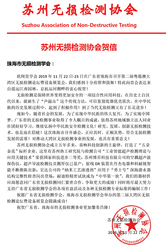 由广东省机械工程学会无损检测分会、深圳机械工程学会无损检测分会、珠海市无损检测学会、广东汕头超声电子工程技术开发中心和中国无损检测学会信息中心共同主办的第二届粤港澳大湾区无损检测论坛暨设备展览会于2019年11月21日~23日如期在美丽的海滨城市-珠海举办。