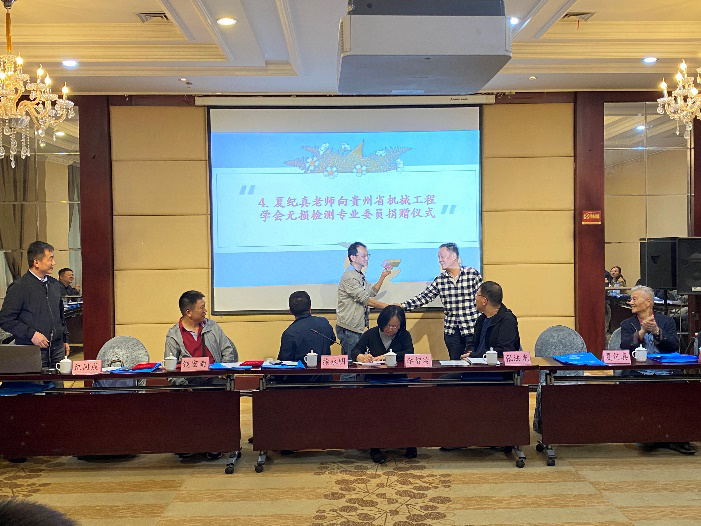 会上,夏纪真老师捐赠两万元支持新一届专委员的工作,并向贵州理工学院理学院捐赠无损检测技术专业教材一批。贵州无损检测专委会分别向宋锡林老师和夏纪真老师颁发终身荣誉理事长证书和终身荣誉理事证书。同时向到会的各行业无损检测单位表示感谢,并对长期以来一直支持贵州无损检测事业发展的广东汕头超声电子股份有限公司颁发特邀理事单位证书。