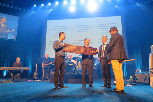 图为沈功田主任委员代表中国无损检测学会向瑞典无损检测学会馈赠纪念品
