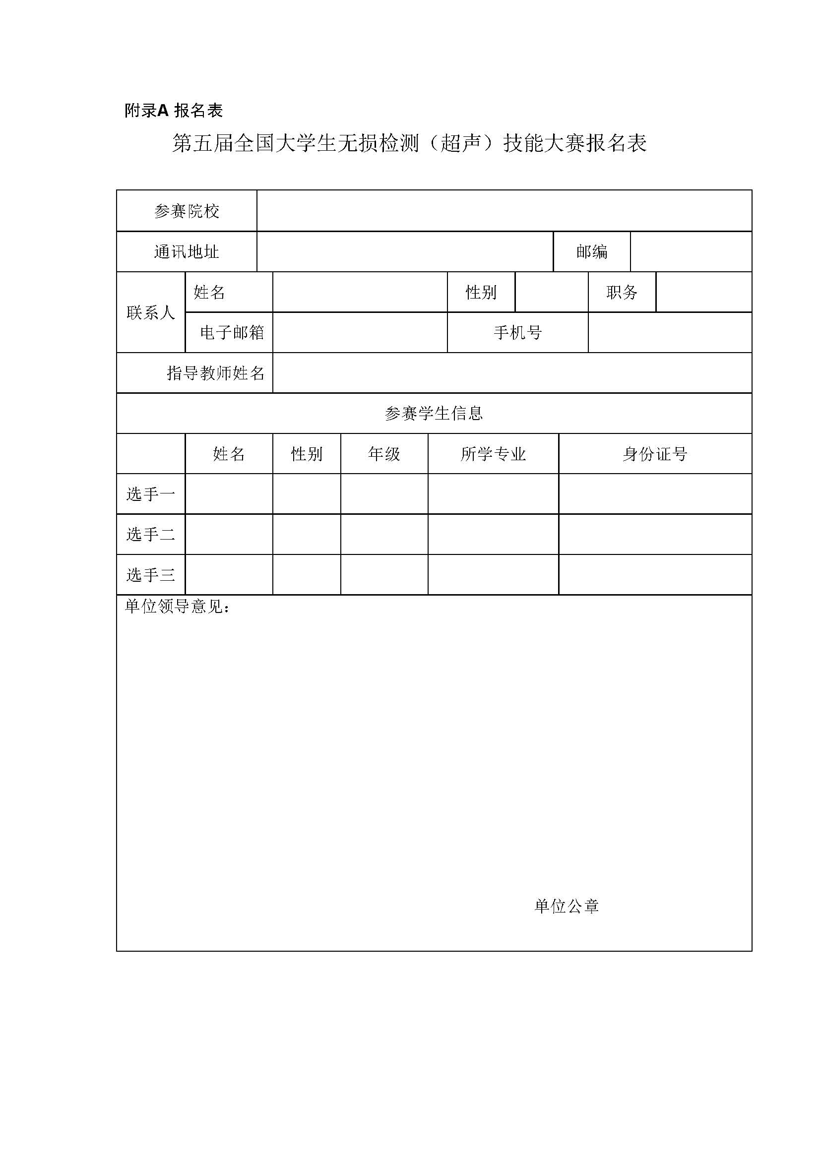 (三)有意参赛院校,请填写《第五届全国大学生无损检测(超声)技能大赛报名表》(见附件,参赛学生信息暂时不填)于2019年5月31日前将扫描件发送至29093647@qq.com。