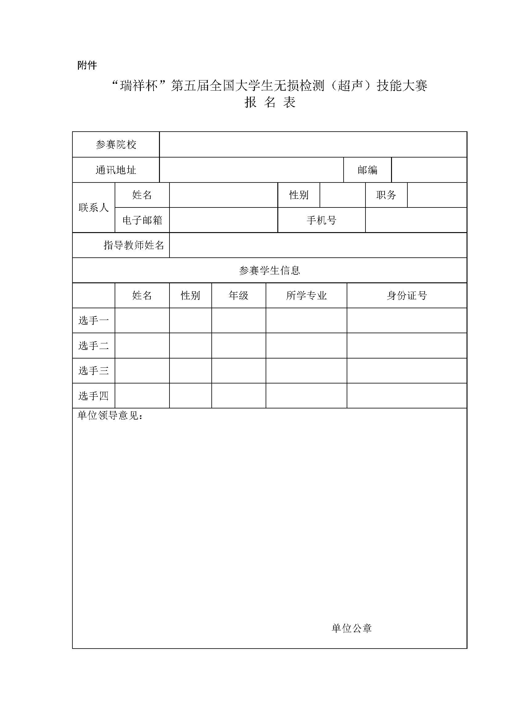 有意参赛院校,请填写《“瑞祥杯”第五届全国大学生无损检测(超声)技能大赛报名表》于2019年9月15日前将扫描件发送至29093647@qq.com。